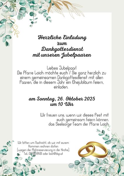 Dankgottesdienst mit den Jubelpaaren Herzliche Einladung an alle Ehepaare, die in diesem Jahr ein Jubiläum feiern! mehr: Dankgottesdienst mit den Jubelpaaren